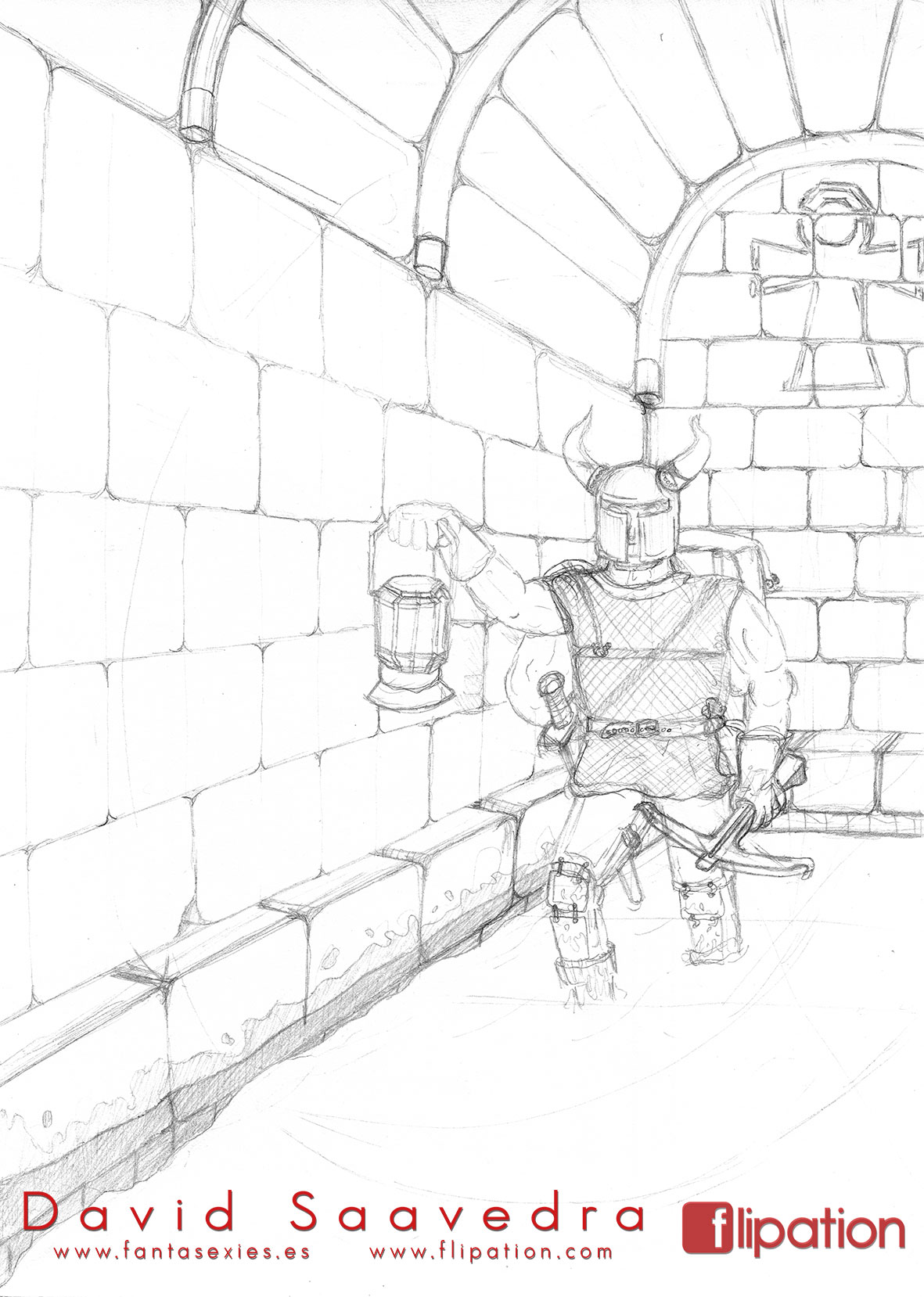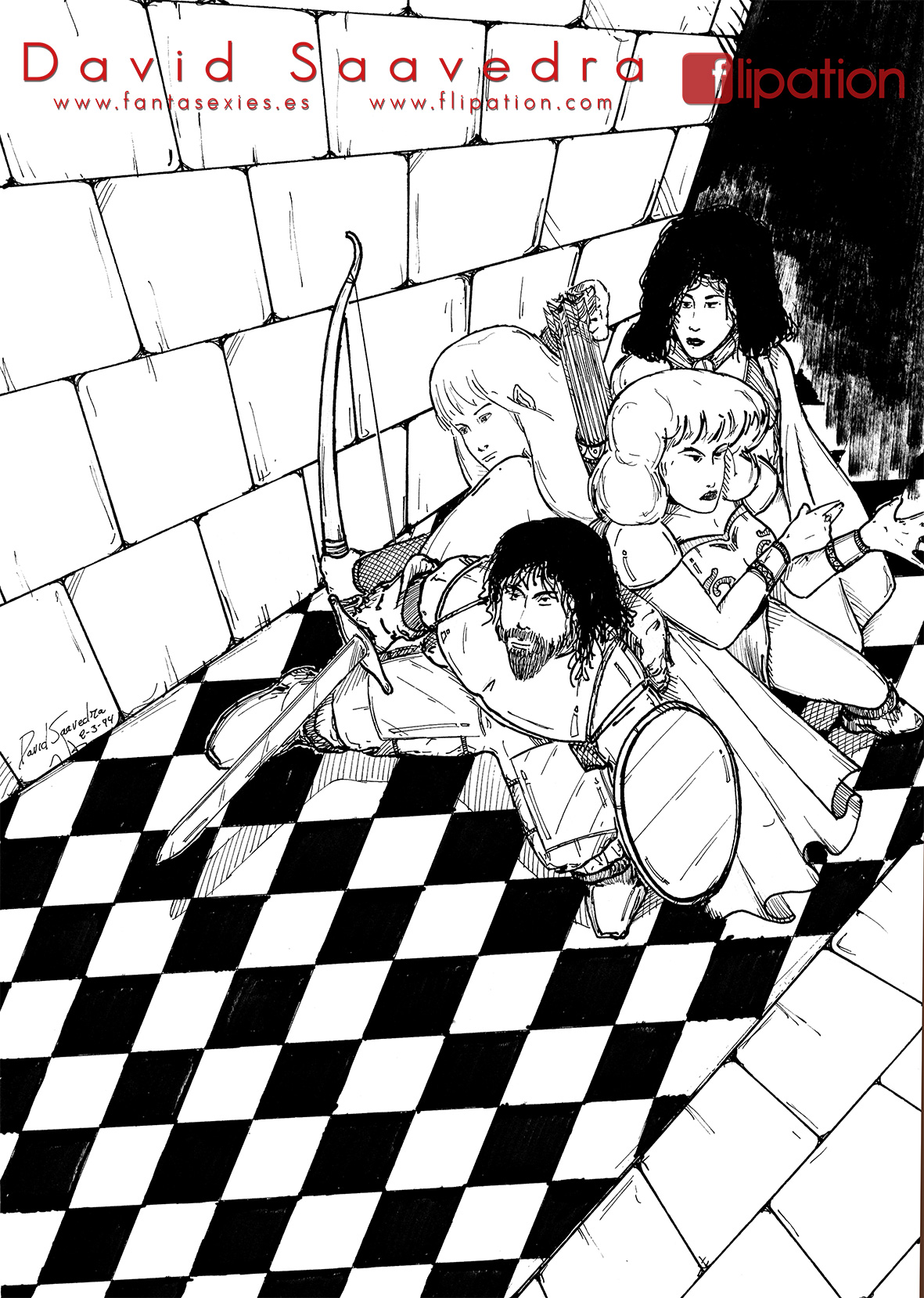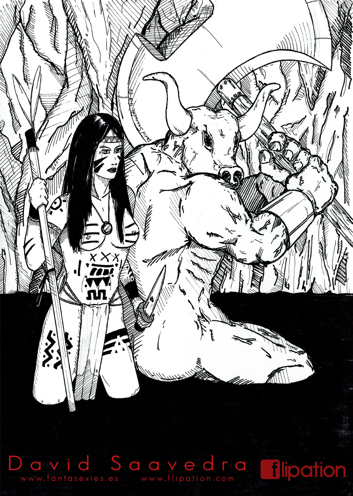 Dibujo de fantasía de una guerrera junto a un minotauro explorando unas cuevas inundadas. Publicado en el nº4 del fanzine de Akira Comics.
