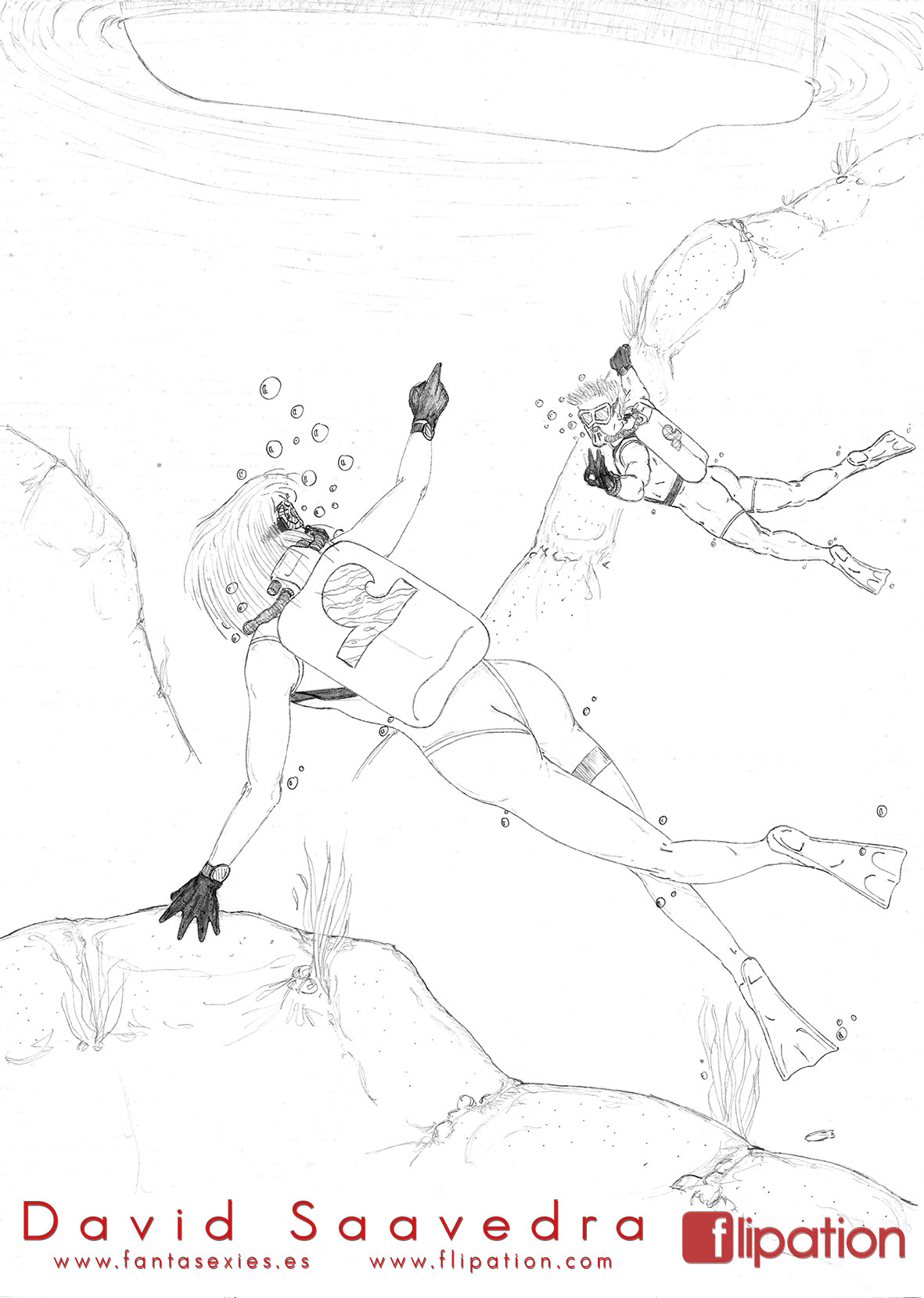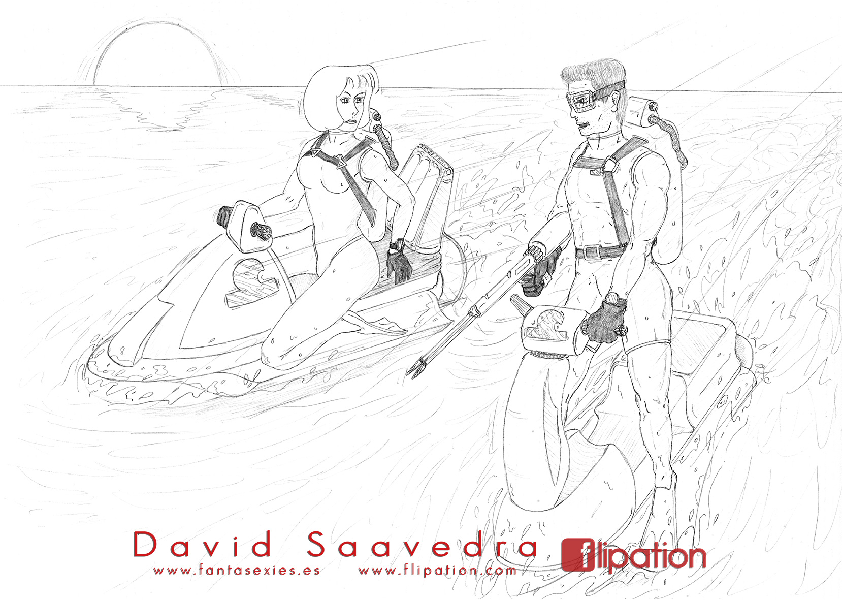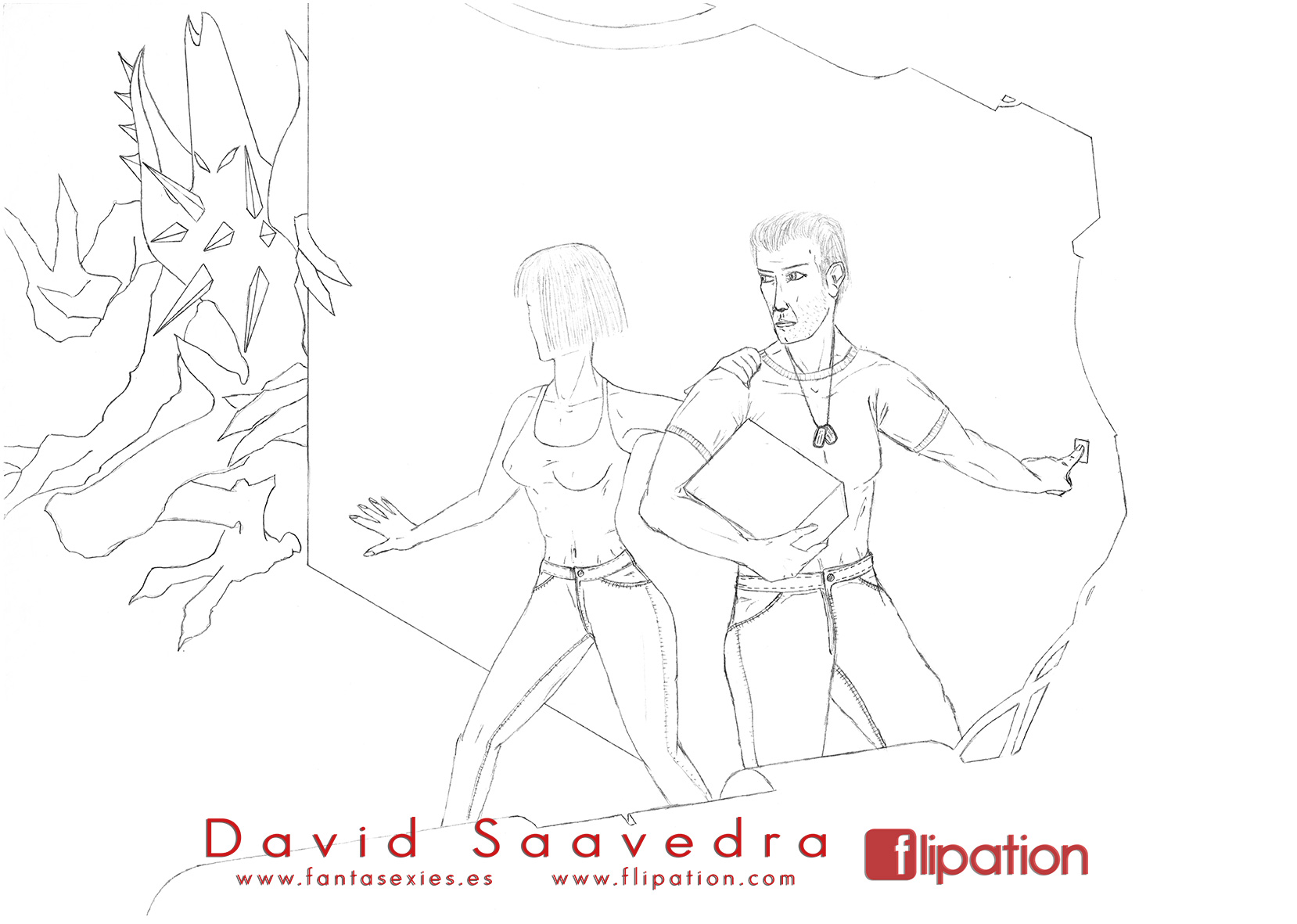 Dibujo de fantasía de una guerrera junto a un minotauro explorando unas cuevas inundadas. Publicado en el nº4 del fanzine de Akira Comics.
