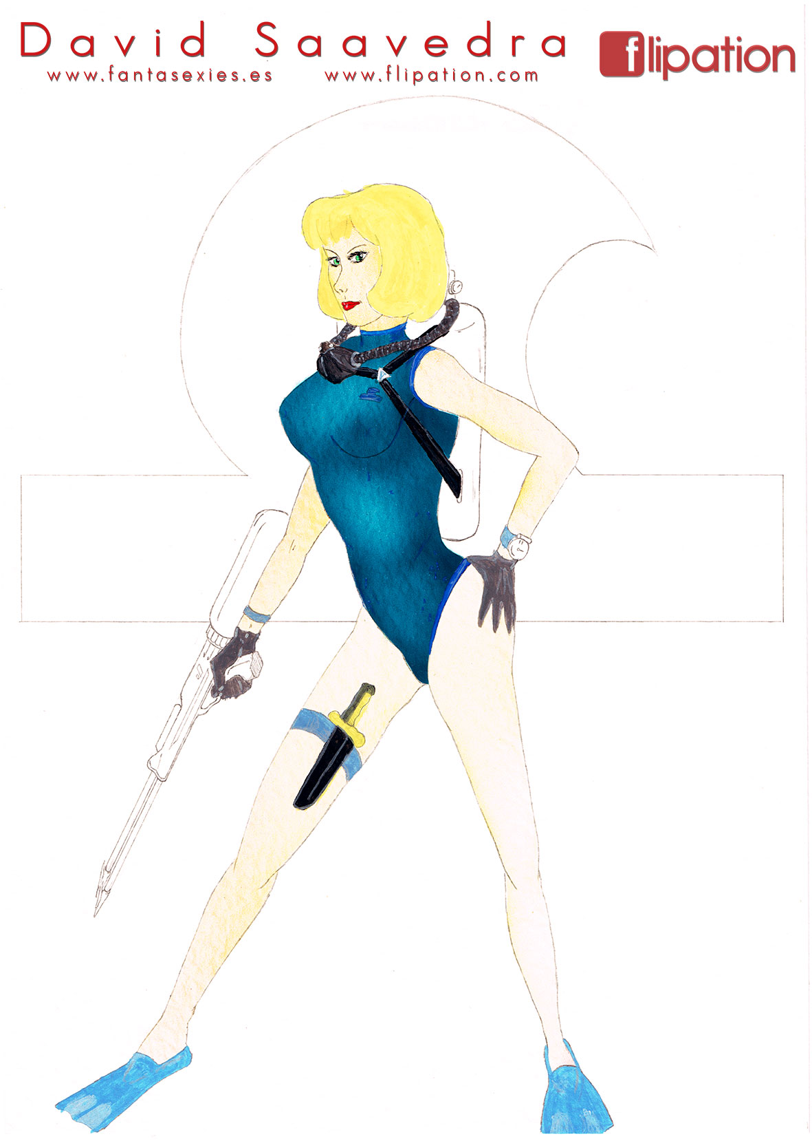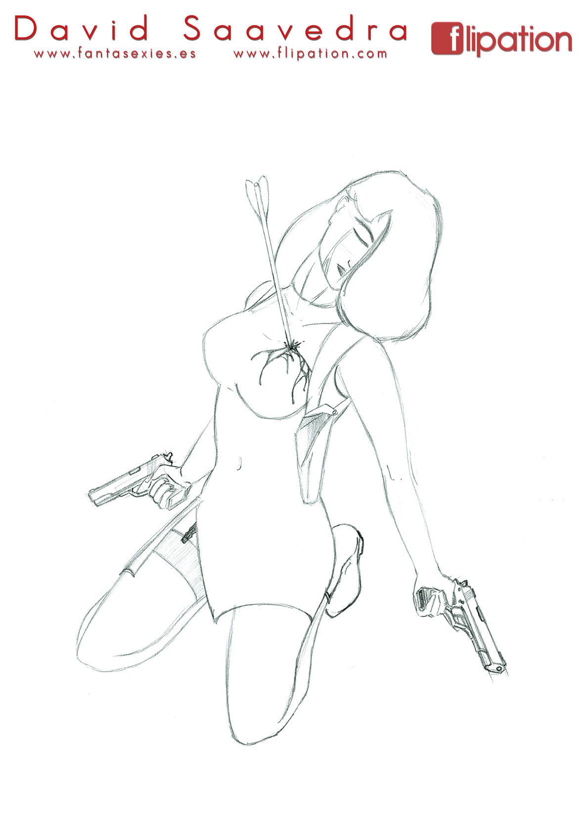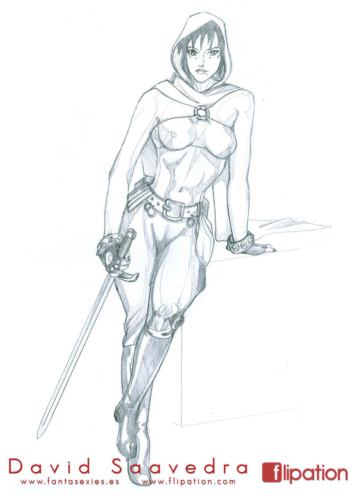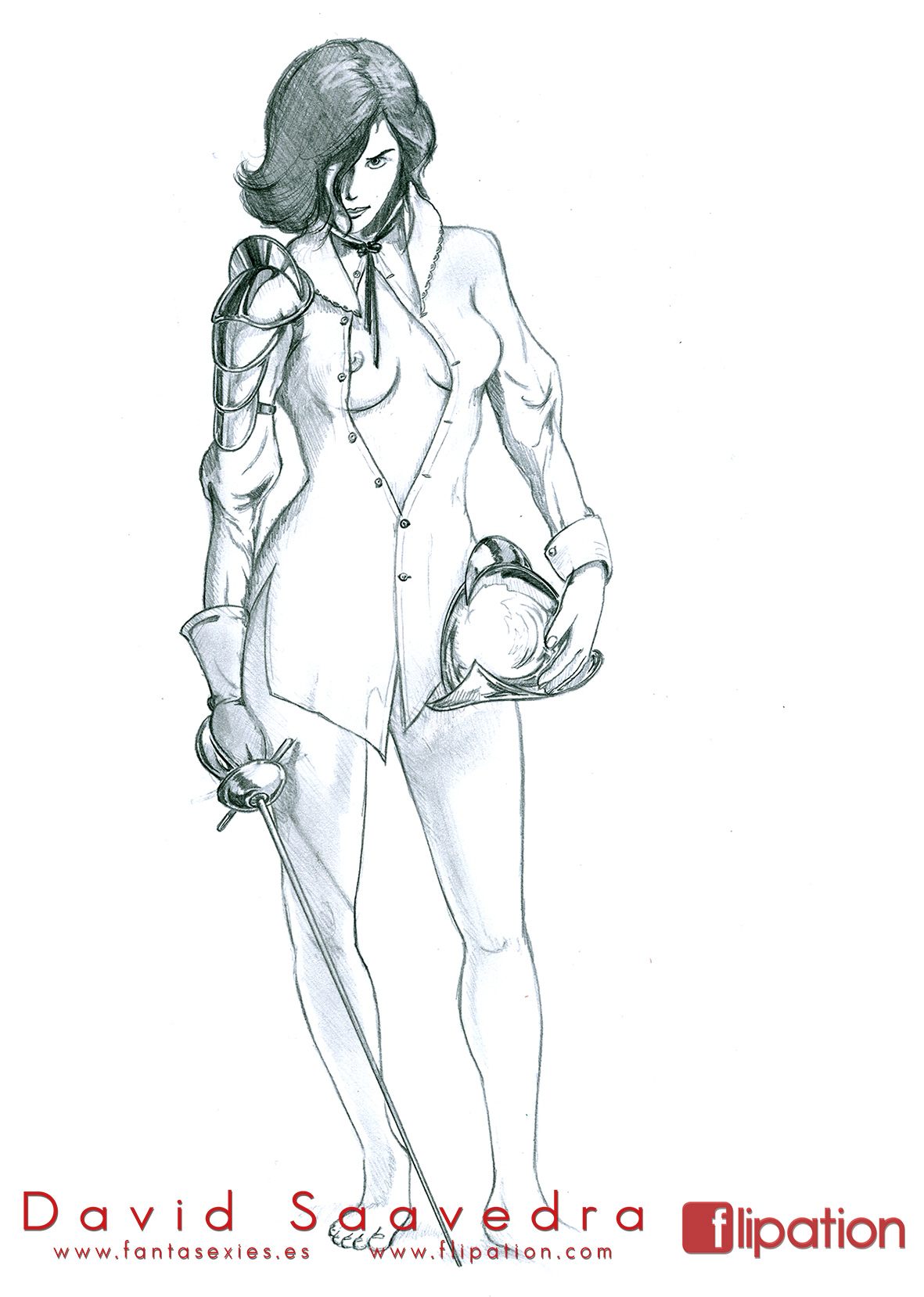 Dibujo pin-up de una esgrimista ataviada solo cun una camisa y llevando un morrión y una espada ropera.