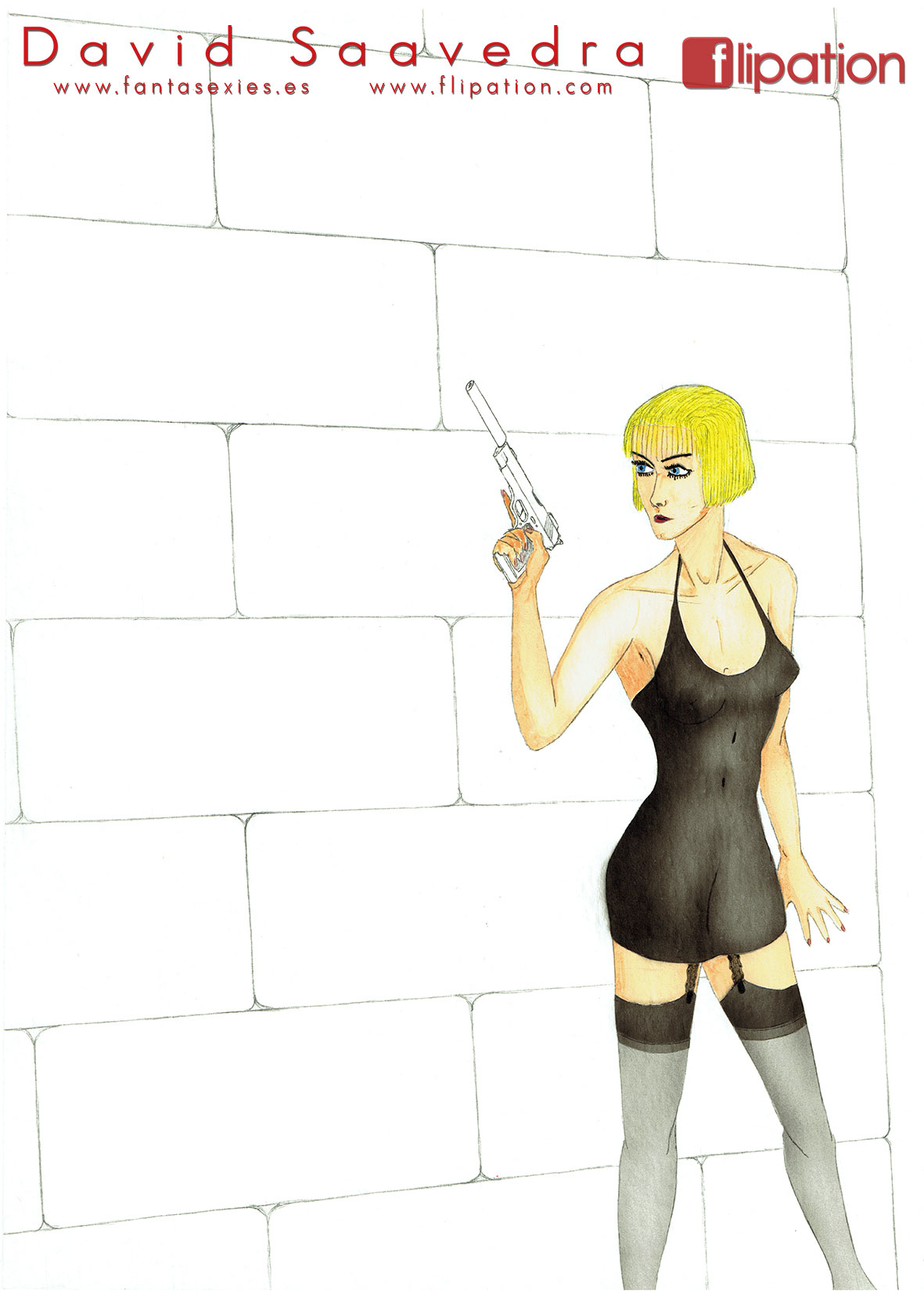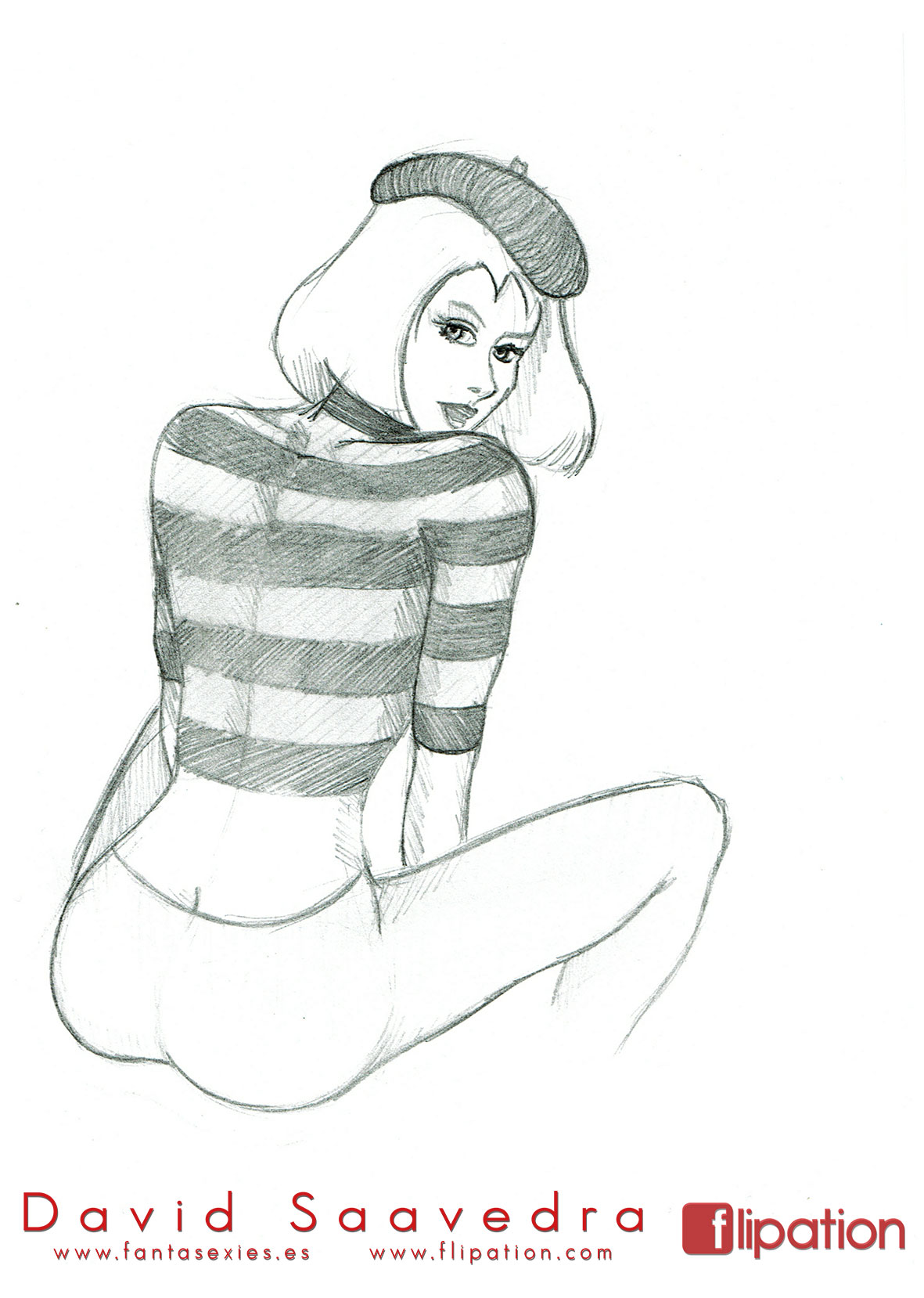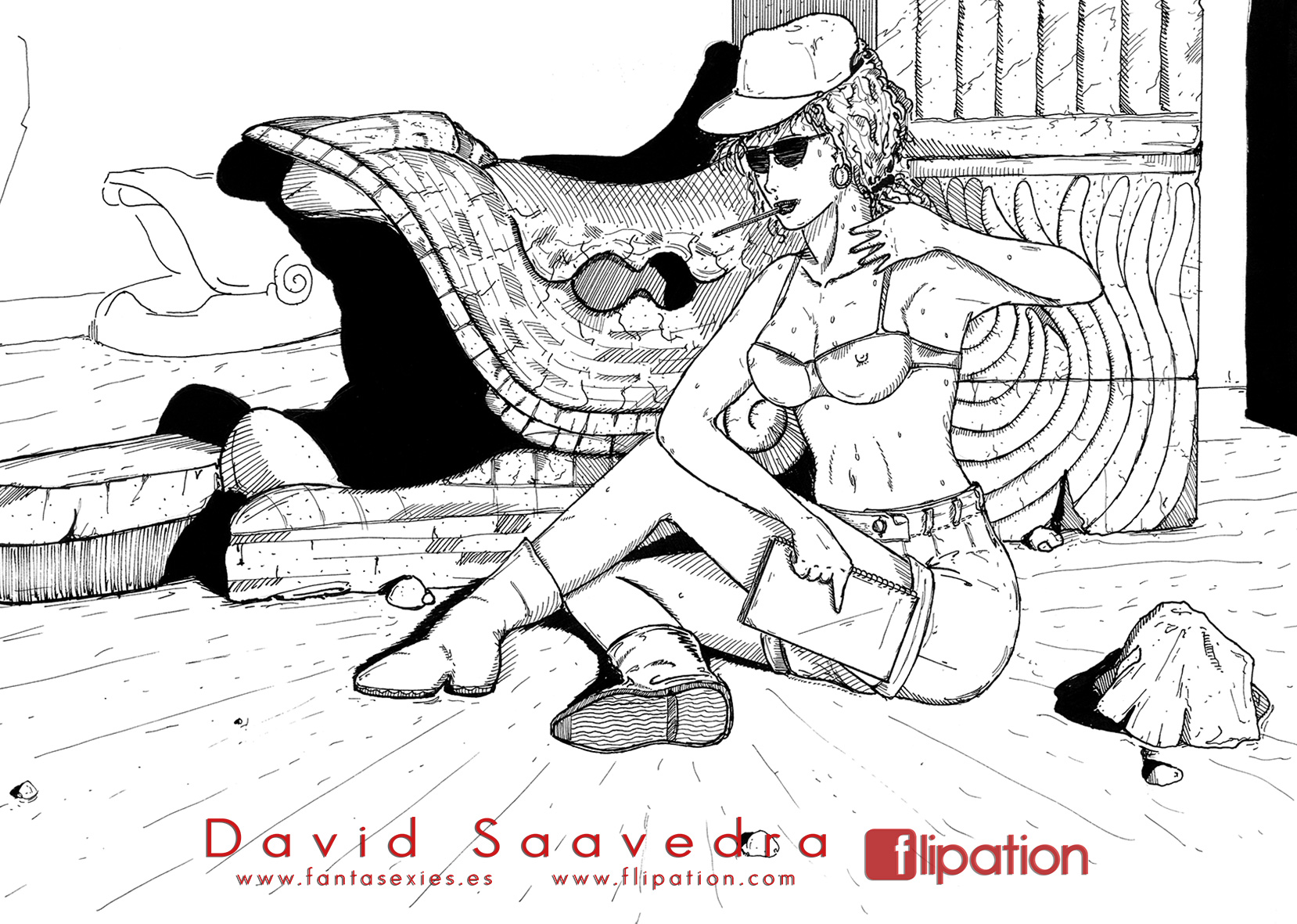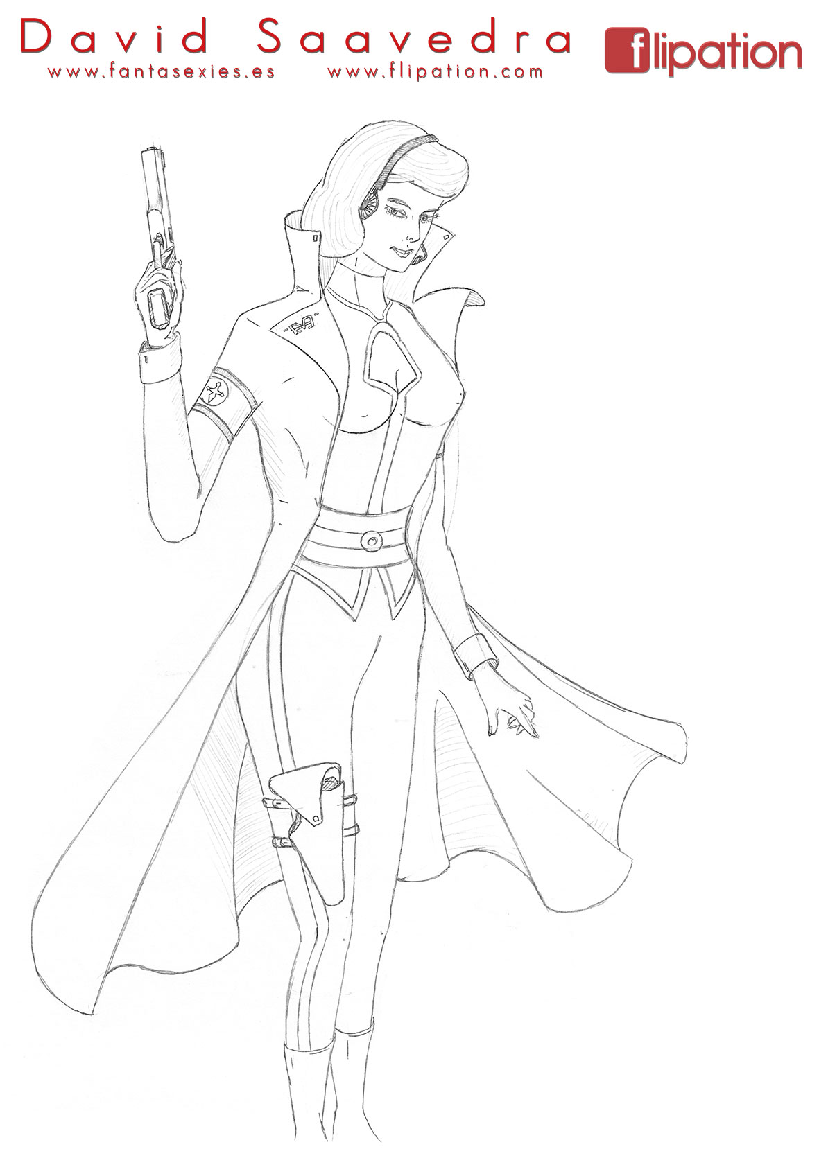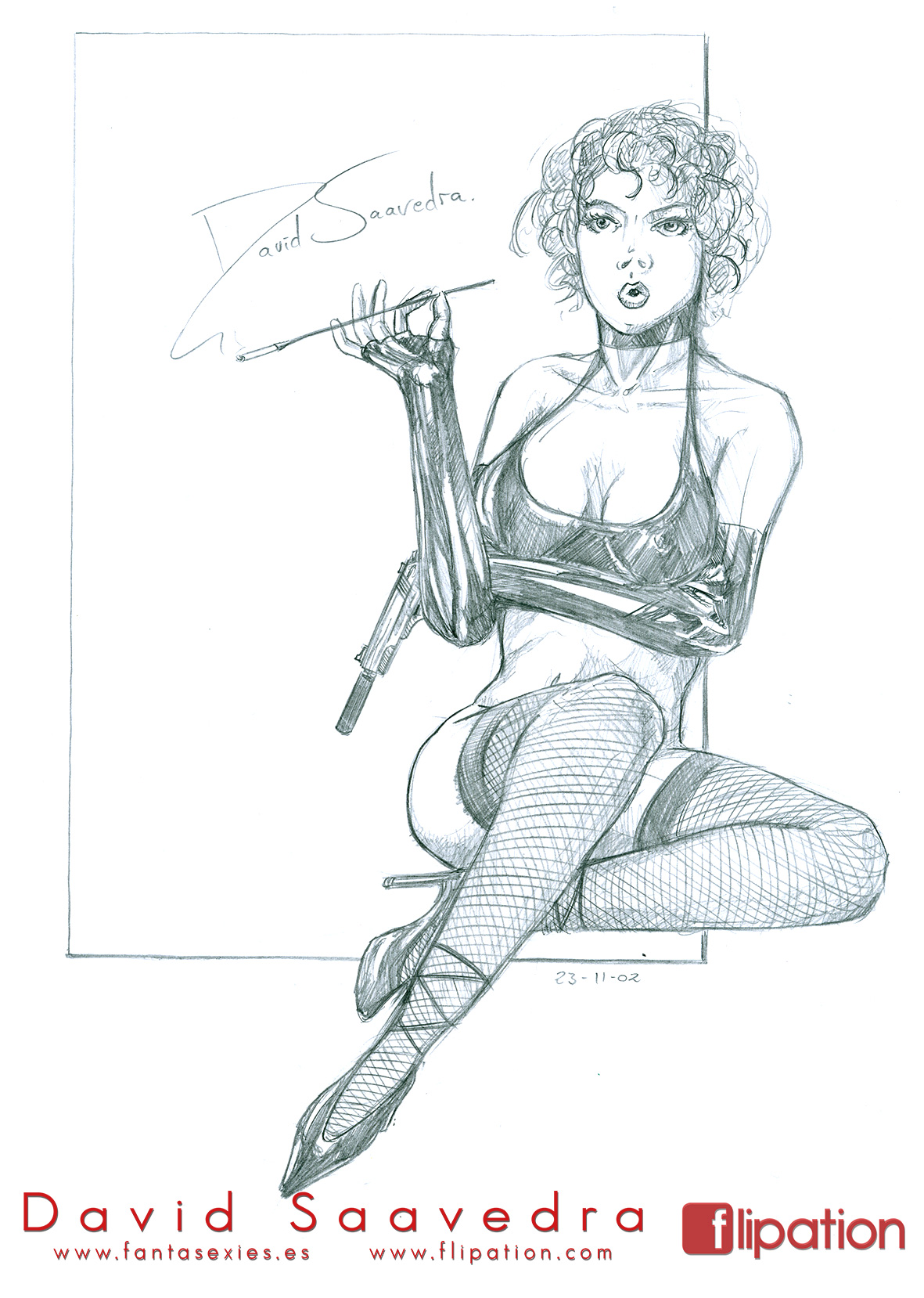 Dibujo pin-up de una esgrimista ataviada solo cun una camisa y llevando un morrión y una espada ropera.