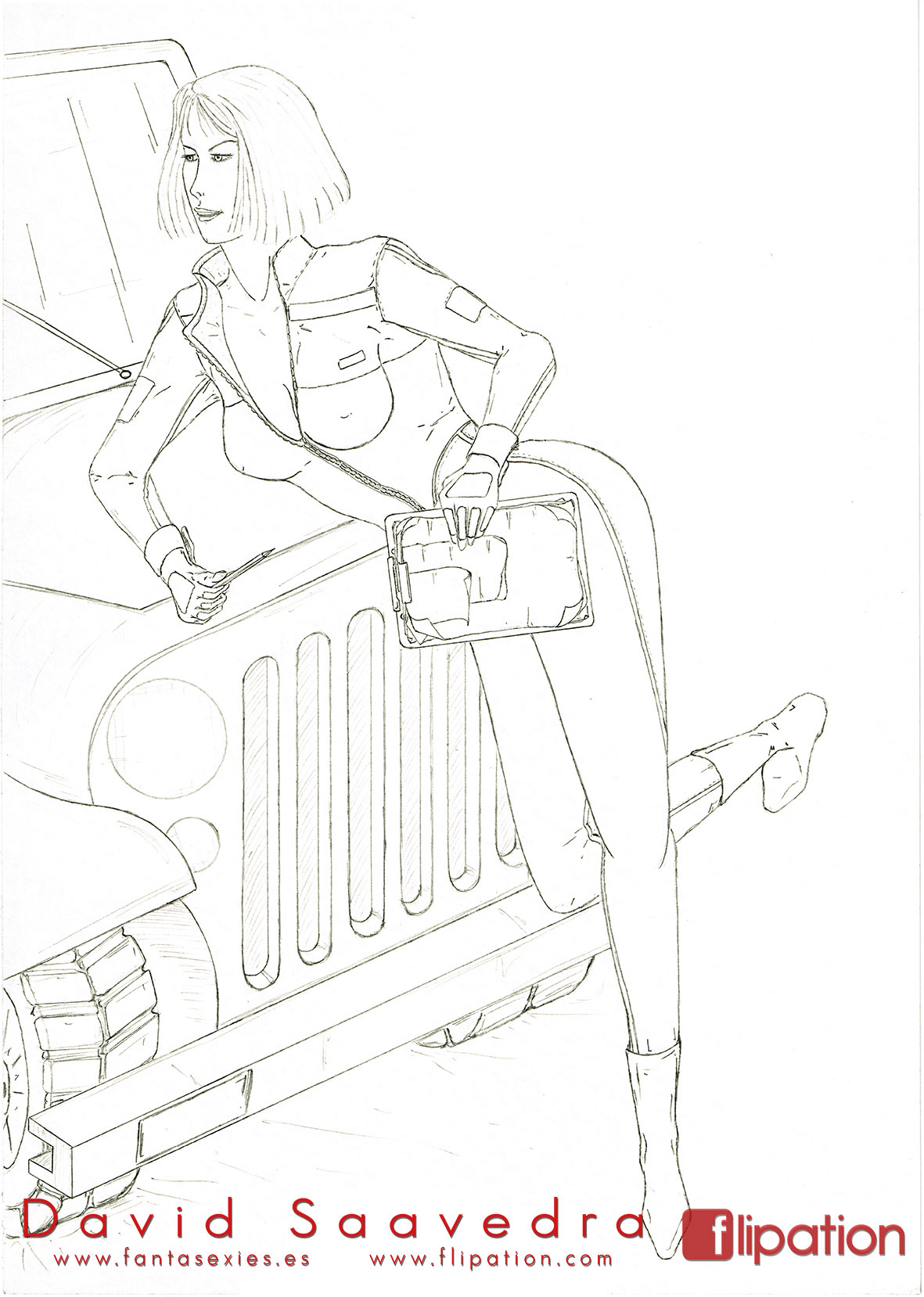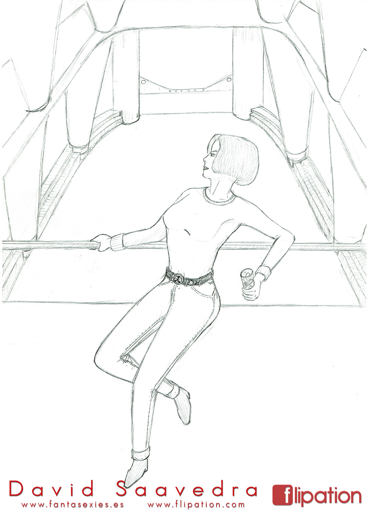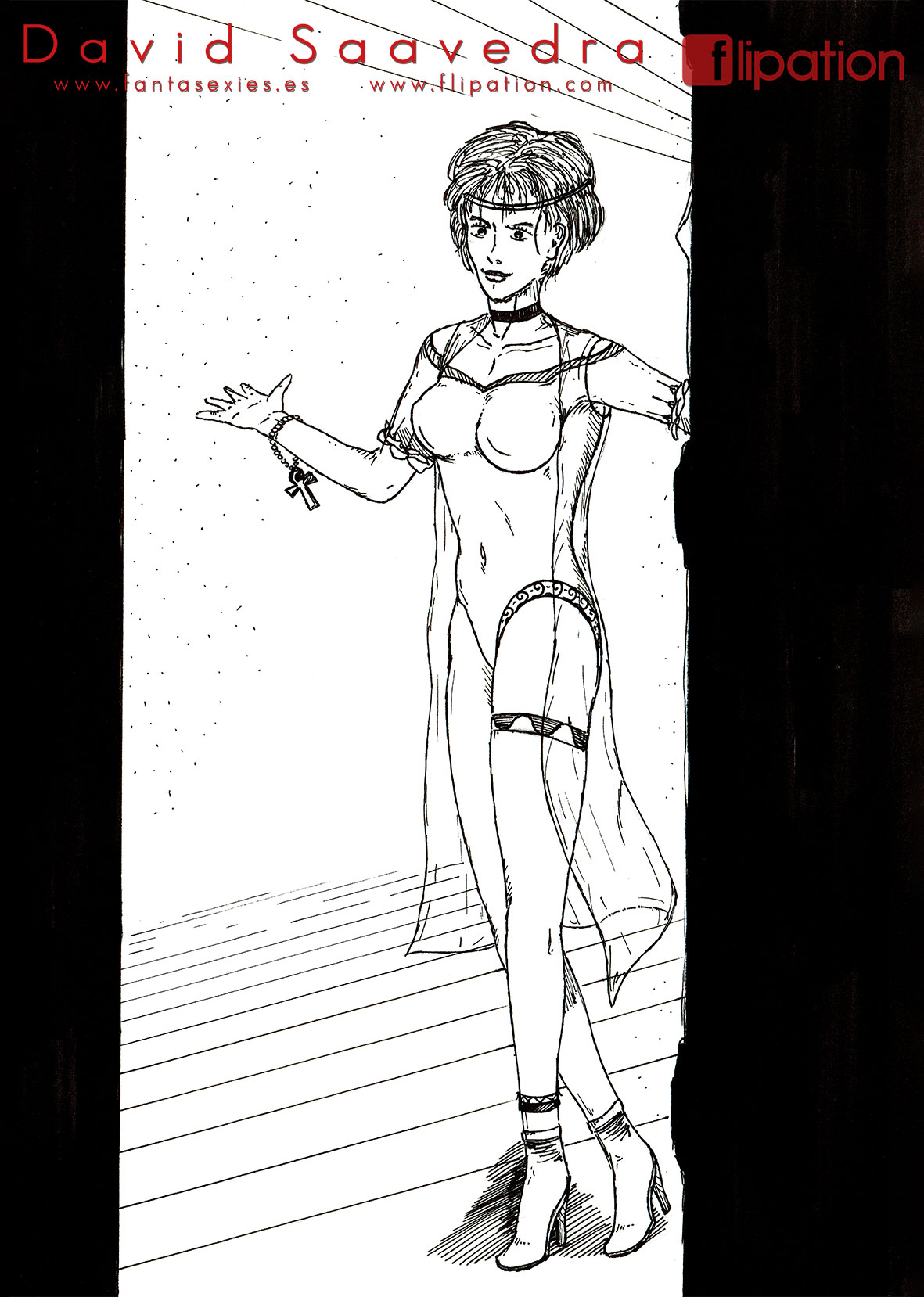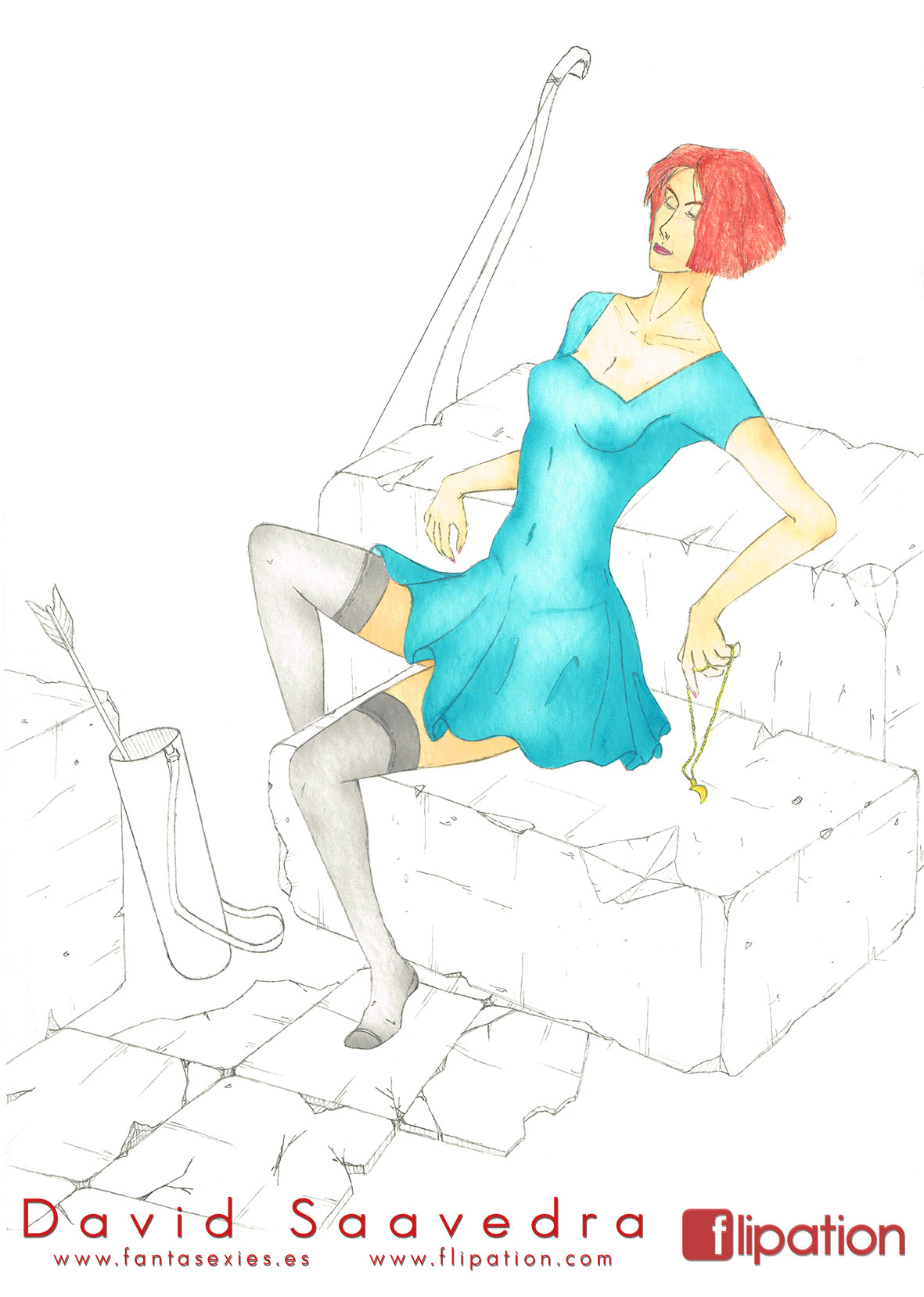 Dibujo pin-up de una esgrimista ataviada solo cun una camisa y llevando un morrión y una espada ropera.