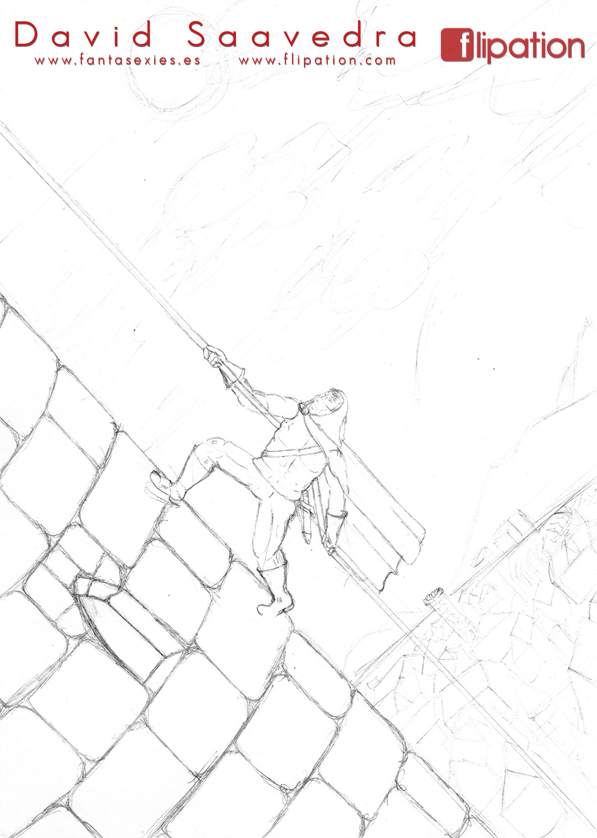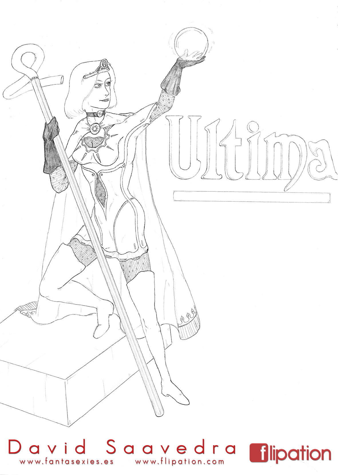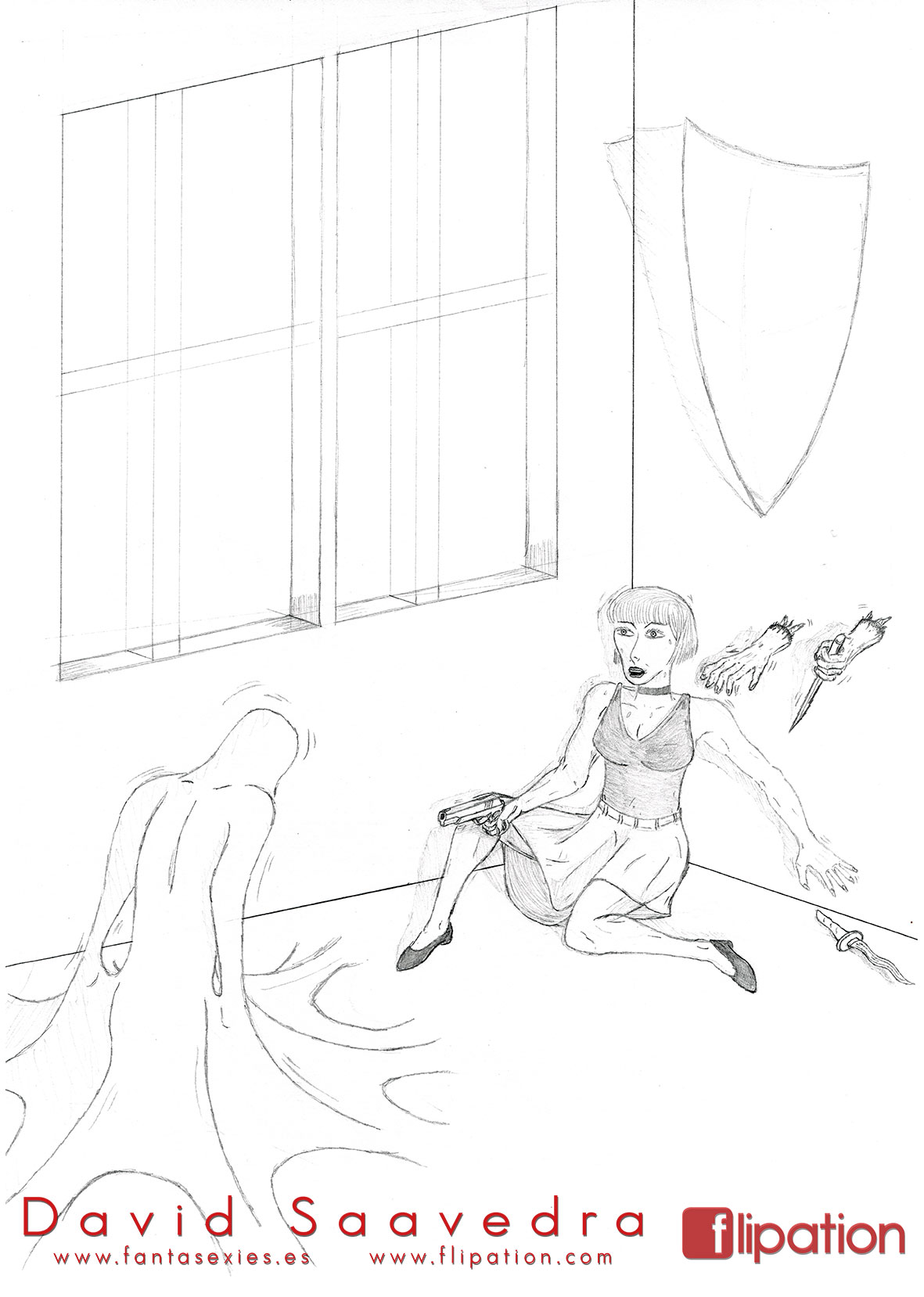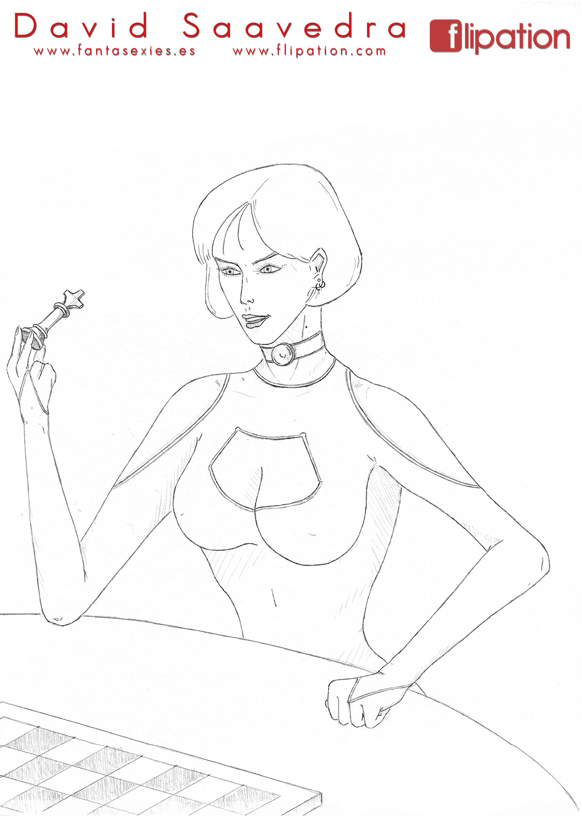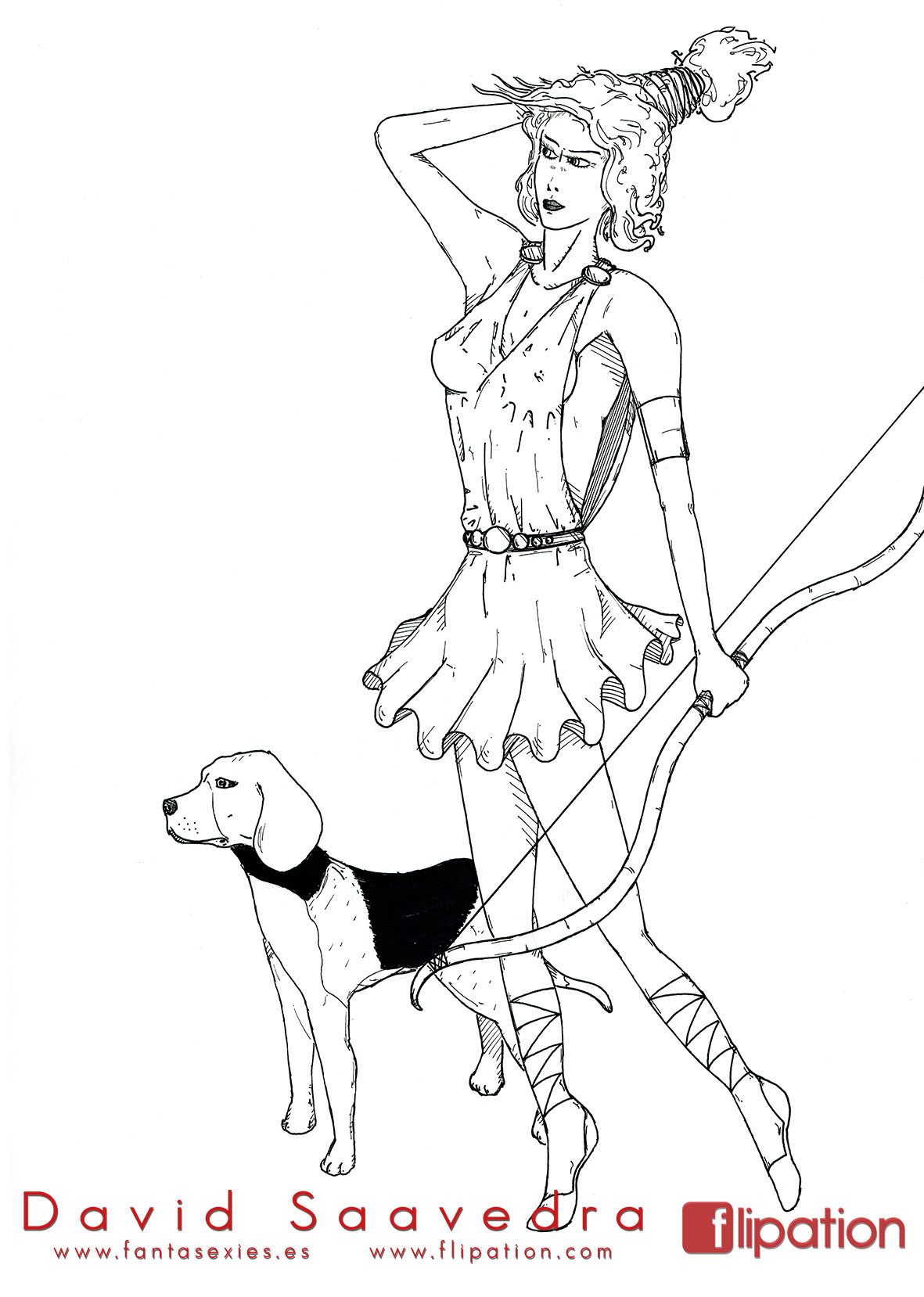 Dibujo pin-up de una esgrimista ataviada solo cun una camisa y llevando un morrión y una espada ropera.
