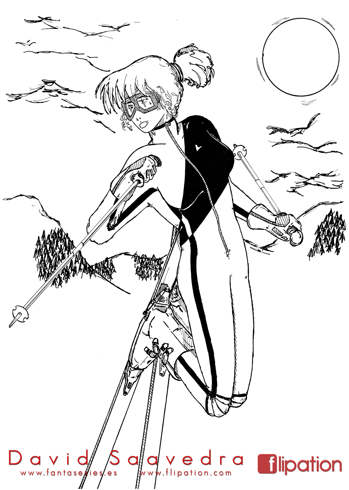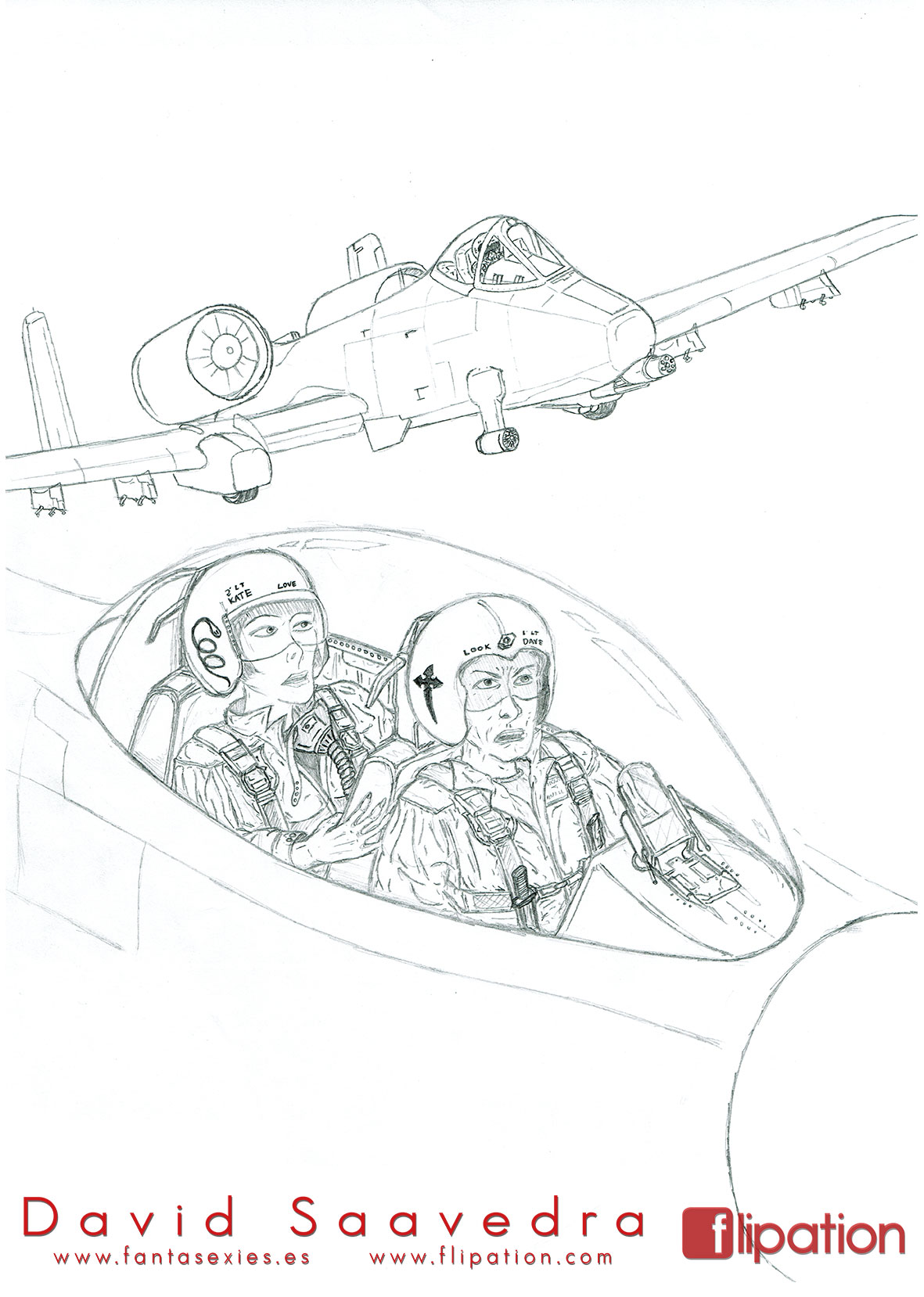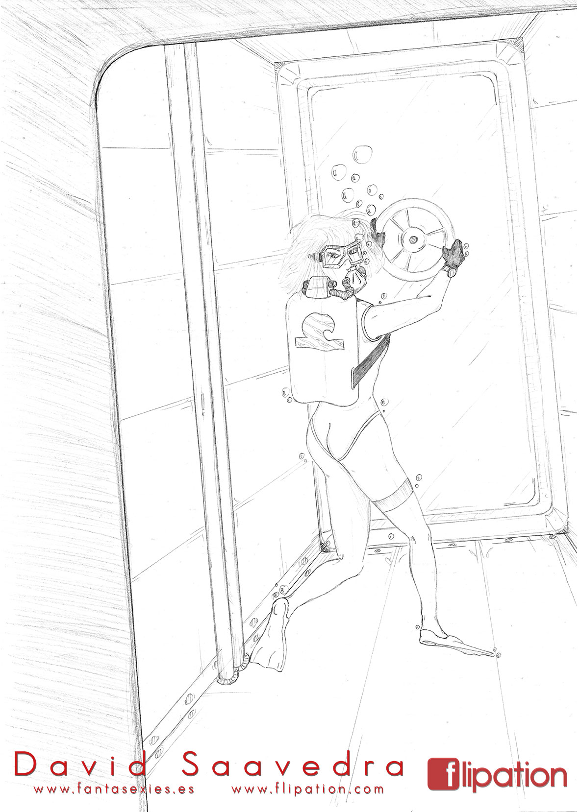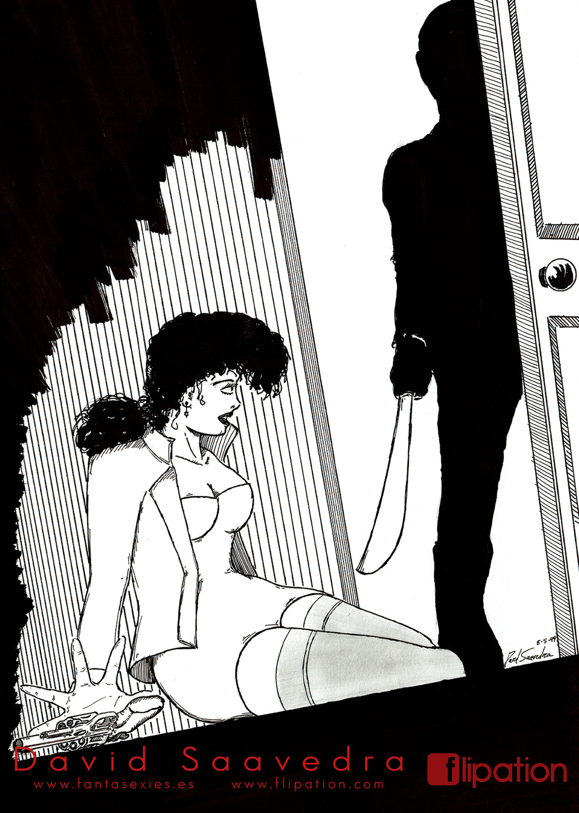 Dibujo pin-up de una esgrimista ataviada solo cun una camisa y llevando un morrión y una espada ropera.