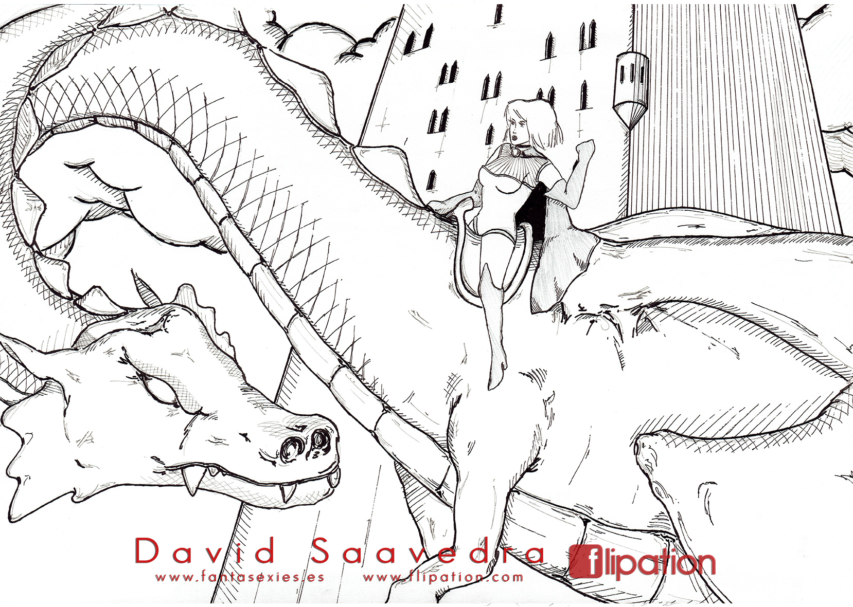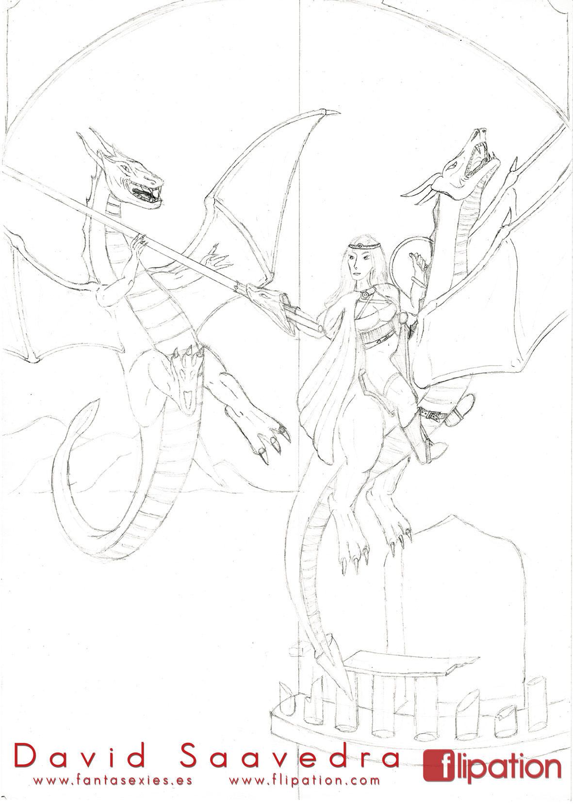 Dibujo de fantasía de una joven guerrera a lomos de un dragón.