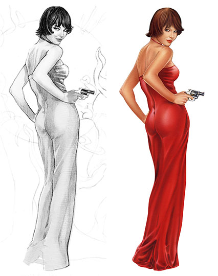 Llevaba mucho tiempo con la idea de dibujar a este personaje, que se presta muy bien al estilo pin-up y que muchos otros artistas ya habían dibujado. Pese a que el concepto era sencillo, el dibujo ha sufrido muchos cambios desde el día en que empecé a diseñarlo. Finalmente le añadí muchísimos detalles al traje y trabajé mucho los brillos del cuero.