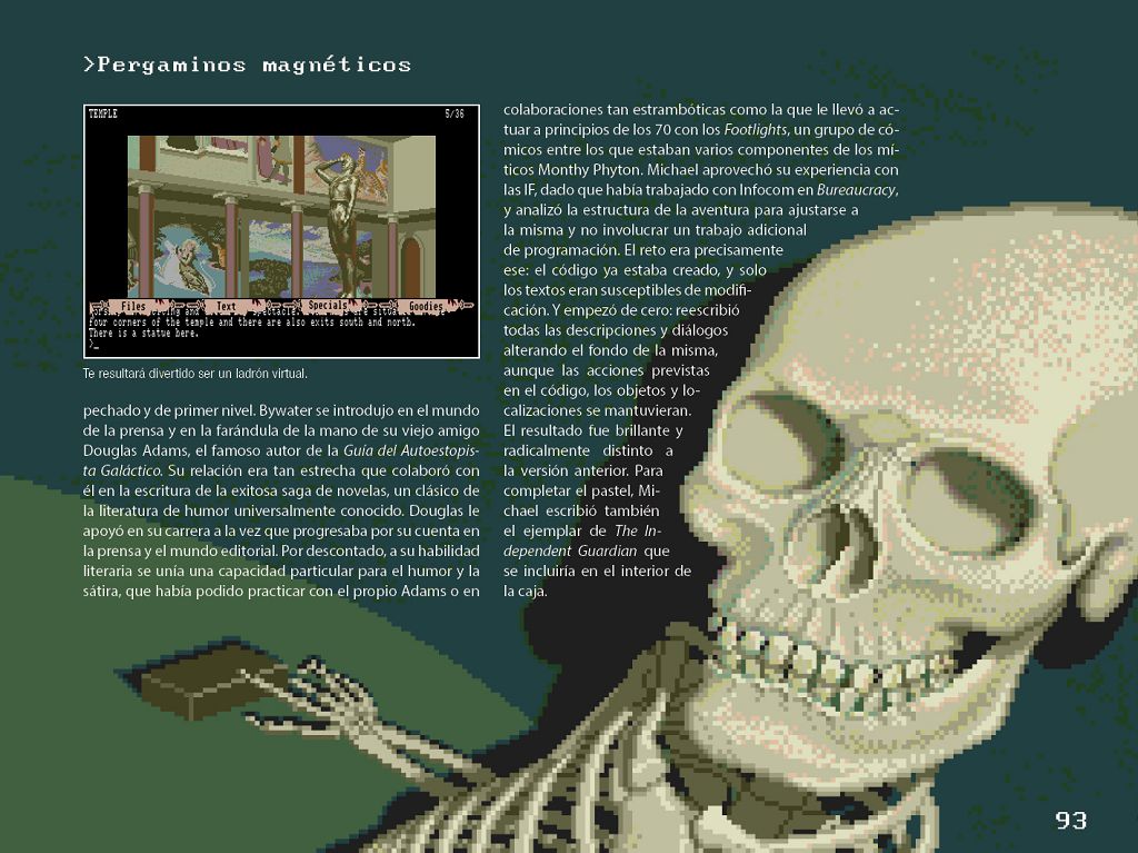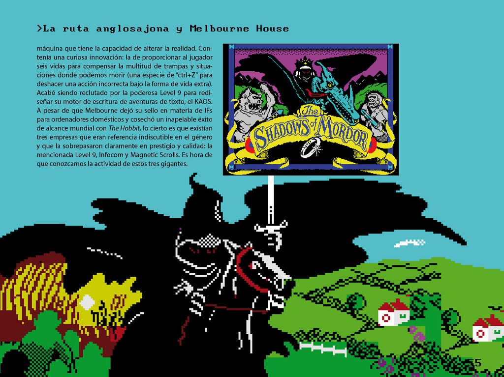 Al igual que con los libros de El Mundo del Spectrum tanto Jesús como Dolmen siguieron contando conmigo para su maquetación y se mantuvo el mismo formato para darle una cierta continuidad con los anteriores. La maquetación no me llevó más de dos semanas y aprendí muchas cosas más de las que ya sabía sobre este género del que yo también fui un ávido jugador durante mi época con el Spectrum, por lo que disfruté maquetando las partes dedicadas a las aventuras conversacionales españolas, sobretodo durante su apogeo con Samudio y Aventuras AD.
