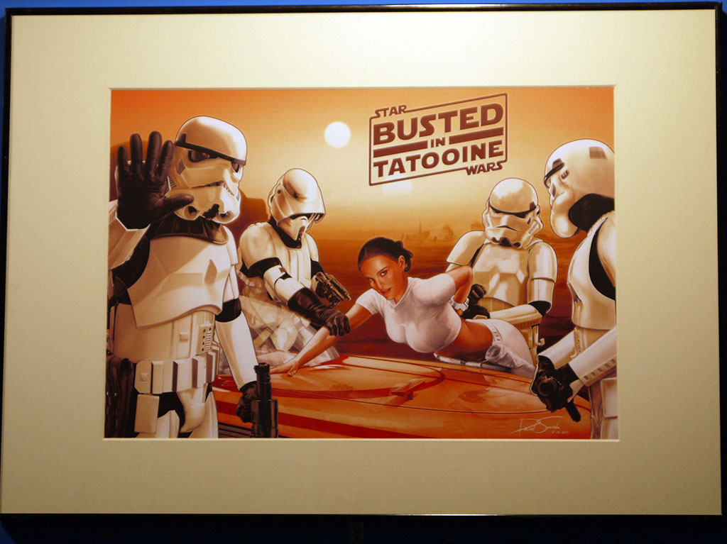 Es difícil destacar con un dibujo que sea original cuando ilustradores de renombre y miles de fans hacen todo tipo de dibujos increíbles basados en los personajes de la saga. En un principio pensé en hacer un dibujo de la nueva protagonista del Episodio VII: Rey. Pero no encontré nada que me motivase. Para mi la heroína más sugerente de la saga ha sido siempre Natalie Portman en el papel de Padme. De manera que me centre en hacer una ilustración con ella como sujeto principal. Hace unos meses que había recopilado imágenes de la presentadora y modelo de Playboy Sara Jean Underwood vestida con el traje blanco ceñido que lucía Amidala en el Episodio II posando de forma sugerente mientras lavaba un coche por una causa benéfica. Tenía la pose, pero me faltaba un contexto. Mi afición por los videojuegos me trajo a la mente una de las ilustraciones de GTA V y enseguida compuse un crossover entre el estilo de GTA y el universo Star Wars. Así que la idea terminó con una Padme arrestada en el desierto de Tatooine por un grupo de soldados de asalto, imaginamos que por conducir demasiado deprisa su landspeeder.