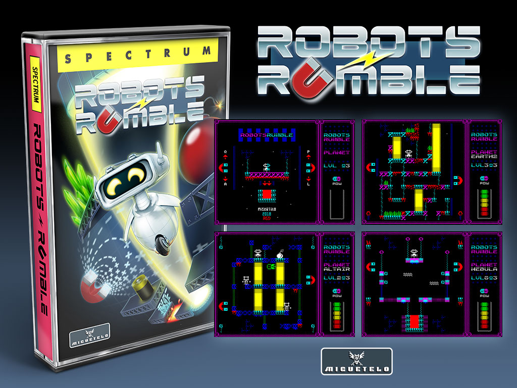 En septiembre de 2018 mi amigo Miguel Ángel (alias Miguetelo) lanzaba un nuevo juego para ZX Spectrum: Robots Rumble, un juego de puzle, hecho con el engine AGD, en el que controlamos dos imanes a cada lado de la pantalla que no servirán para guiar a un robot hacia su fundición. En el descenso a su reciclaje deberemos evitar todo tipo de peligros como pinchos de kriptonita, bombas, enemigos móviles. El juego es un alarde de originalidad y jugabilidad, ya que deberemos concentrarnos bien en dónde ponemos los imanes para no atraer a nuestro robot a una destrucción prematura.