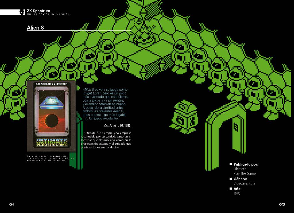 En esta ocasión cambié el formato del libro para diferenciarlo del formato apaisado de los de El Mundo del Spectrum con la idea de que cada juego ocupase dos páginas enfrentadas con una pantalla del juego de fondo. Usar una captura que ocupase ambas páginas hace que el apartado visual sea magnífico, dado que no hay mucho texto y éste está distribuido de manera que no interfiera con los fondos y sprites de la pantalla. Evidentemente, una simple captura de pantalla del juego en ningún caso es ideal y no solo tuve que buscar entre las más características y emblemáticas de cada título sino que necesitaron retocarse para que ningún sprite importante quedara en medio de ambas páginas y respetando los espacios tantos interiores como exteriores de las páginas. Además el tamaño de las dos páginas juntas no es, en escala, proporcional a la pantalla del ZX SPectrum como lo era la página de los libros de El Mundo del Spectrum, por lo que absolutamente todas las pantallas necesitaron recortase y adaptarse a una resolución de 256x186 píxeles y que hace que prácticamente todas las pantallas tengan un tamaño de píxel homogéneo entre sí.